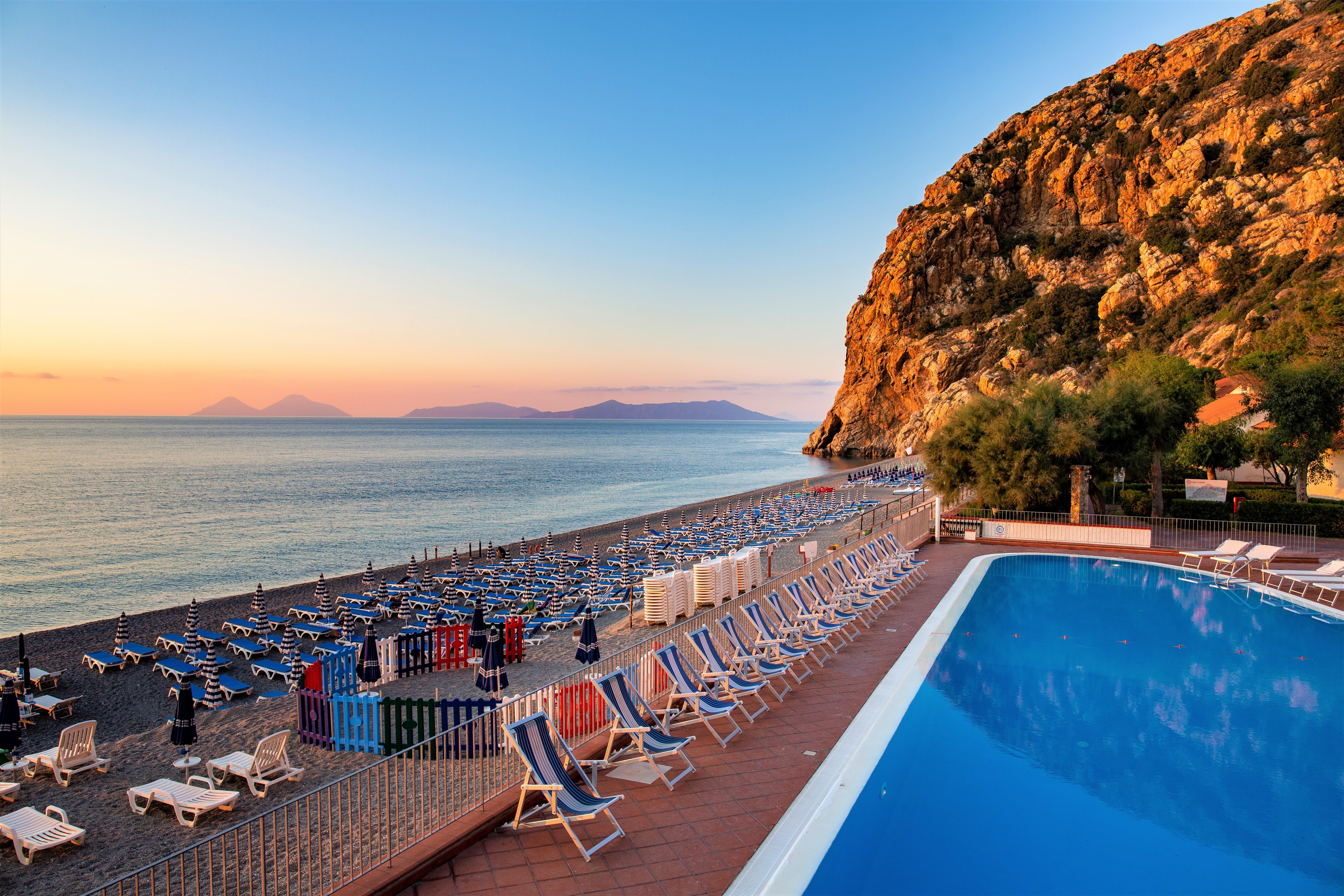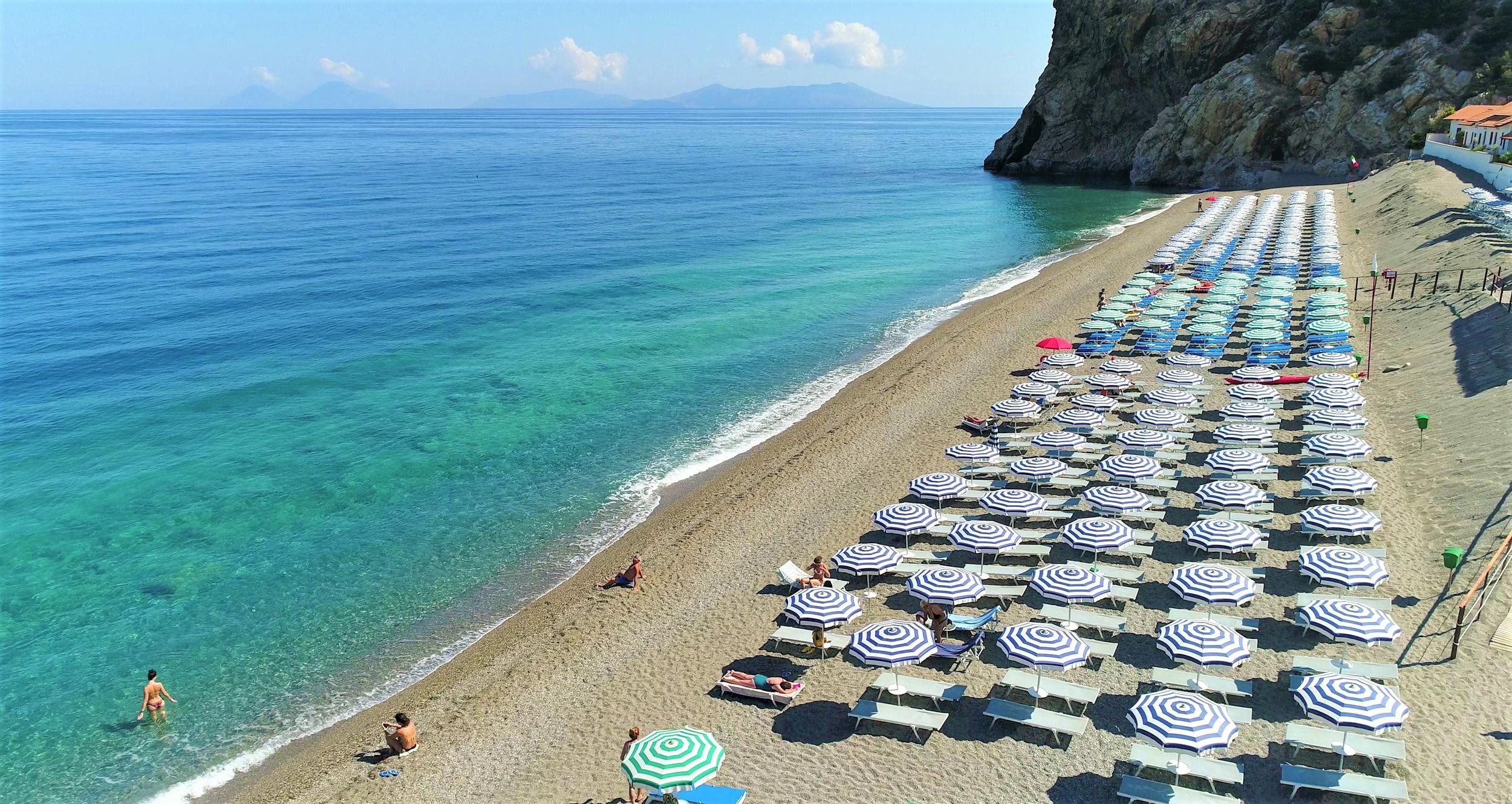 Písečno-oblázková pláž přímo u hotel, 1 slunečník a 2 polohovací křesílka na pokoj od 2. řady zdarma (1. a 2. řada za poplatek), bar na pláži.