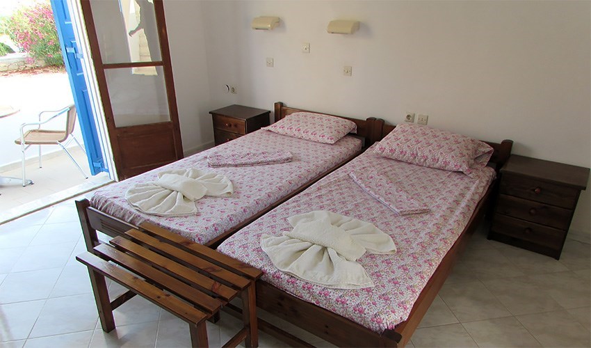 dvoulůžková studia s možností přistýlky pro dítě do 12 let a apartmány až pro 4 osoby (2 místnosti) jsou vybaveny: sociální zařízení (WC, sprcha), kuchyňský kout (lednice, vařič, varná konvice, základní nádobí), klimatizace (za poplatek cca 8 €/den), trezor (za poplatek cca 1,5 €/den), Wi-Fi zdarma, balkon nebo terasa, dětská postýlka na vyžádání zdarma.