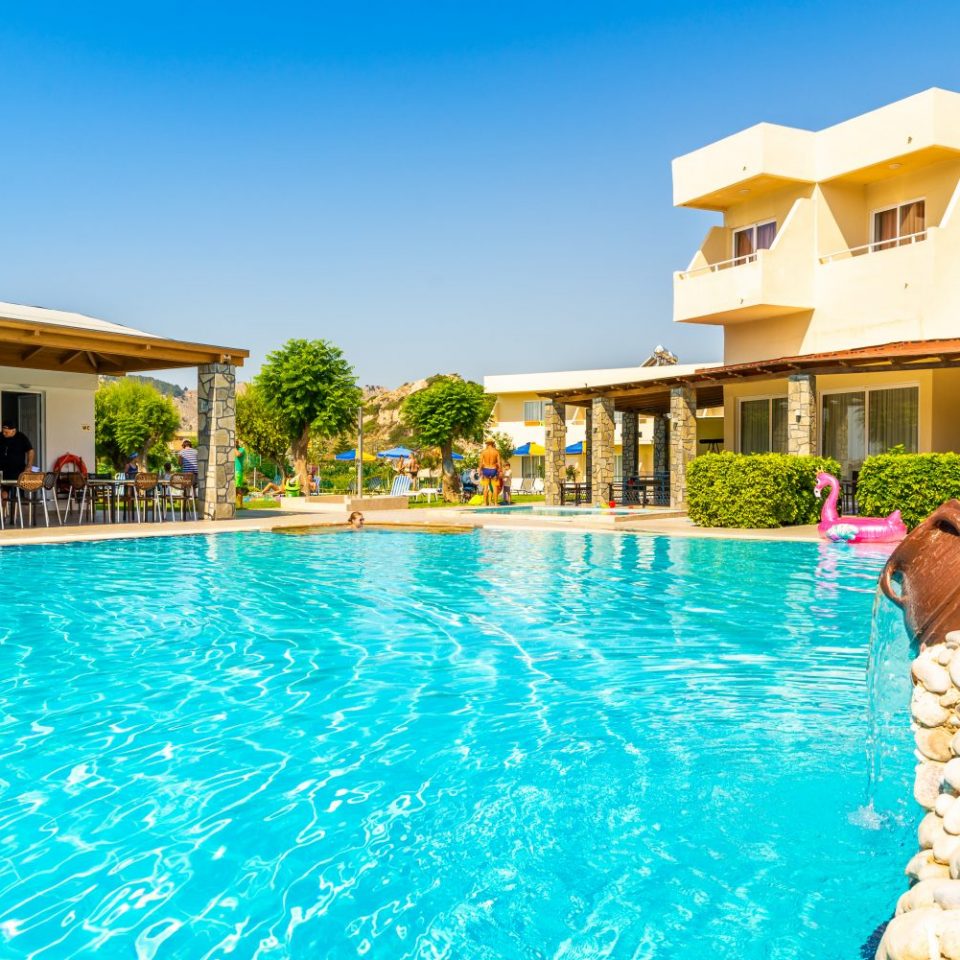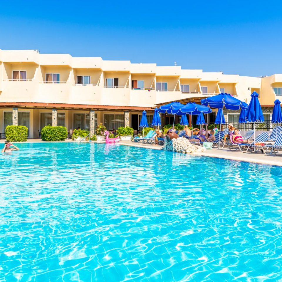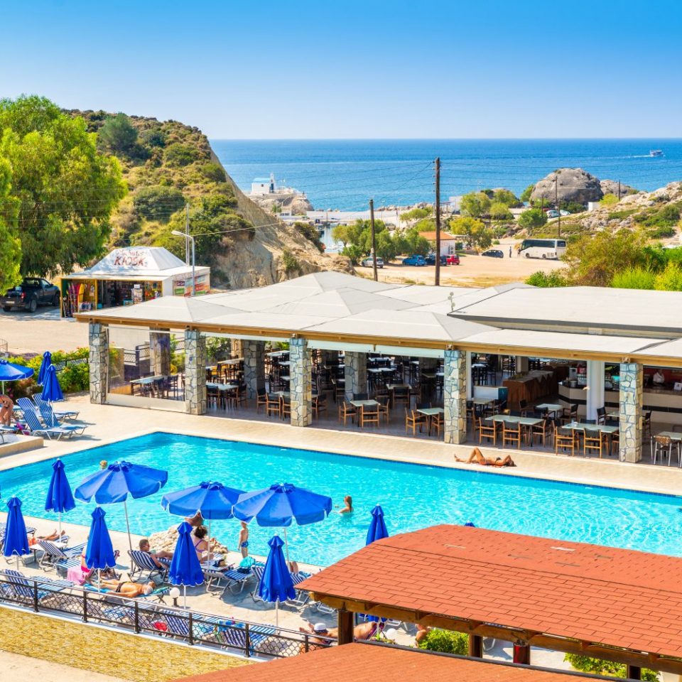 Příjemný hotelový komplex s rodinnou atmosférou se nachází v zahradě, v klidné části letoviska Kolymbia. Restaurace, taverny, bary a obchody cca 300 m, letiště cca 31 kk, autobusová zastávka u hotelu (nabízí spoje do hlavního města Rhodos).