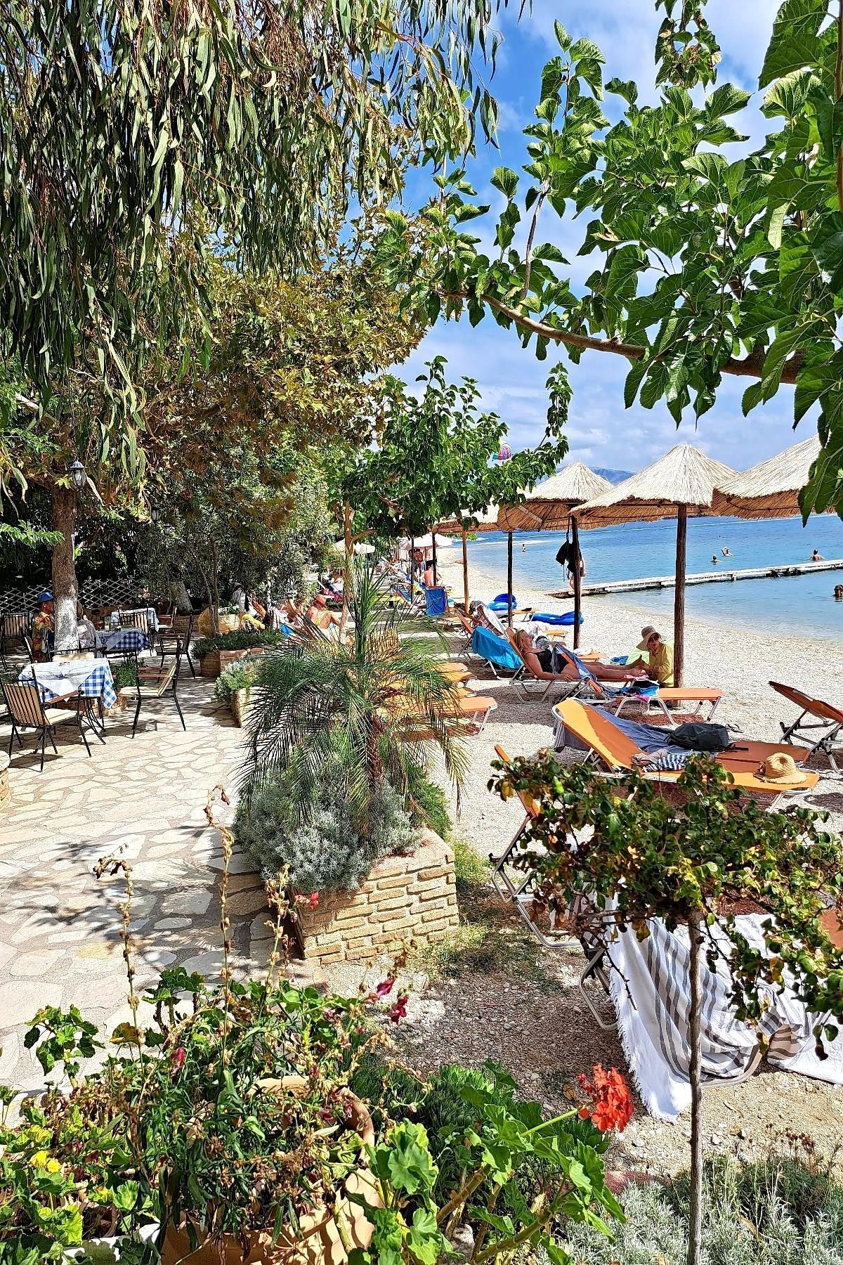 Přímo u písečno-oblázkové pláže, lehátka a slunečníky za poplatek.