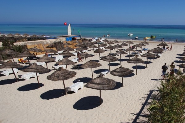 Písčitá pláž cca 100 m, cesta je přes místní komunikací, pozvolný vstup do moře, bar, sprchy a WC, lehátka a slunečníky zdarma, plážové osušky na vratnou zálohu cca 10 TND.