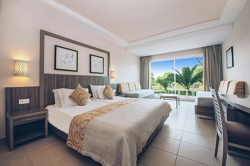 Dvoulůžkový pokoj: koupelna/WC (vysoušeč vlasů), klimatizace (červen–září), TV/sat., telefon, minilednička za poplatek, trezor za poplatek, balkon nebo terasa. Za příplatek: Dvoulůžkový pokoj s výhledem do zahrady: stejné vybavení, jen je prostornější, výhled do zahrady. Dvoulůžkový pokoj s výhledem na bazén: stejné vybavení, jen je prostornější, výhled na bazén. Dvoulůžkvý pokoj s výhledem na moře: stejné vybavení, jen je prostornější, výhled na moře.Dvoulůžkový pokoj se spojovacími dveřmi : stejné vybavení, 2 propojené pokoje. Rodinný pokoj: stejné vybavení, prostornější.