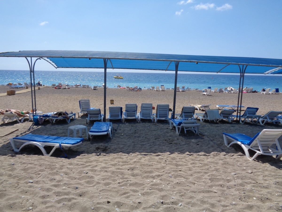 Pěkná písečná pláž s oblázky se nachází asi 150 metrů od hotelu a je přístupná přes místní komunikaci. Lehátka, slunečníky a plážové osušky zdarma.